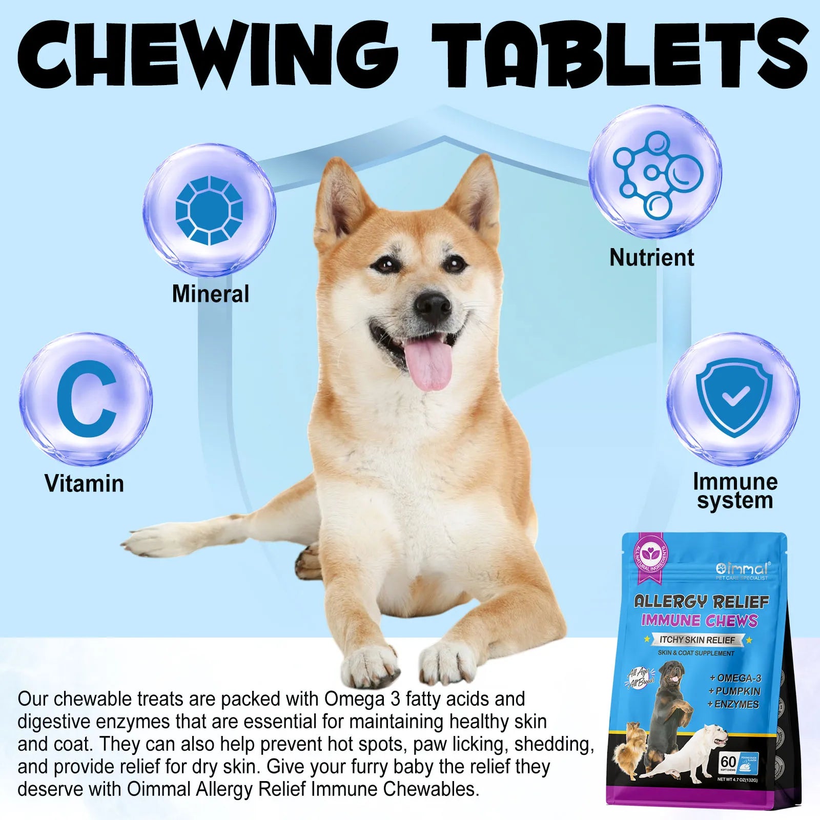 如果您的愛犬經常發癢、舔爪子、皮膚乾燥或有季節性過敏,我們的狗狗抗過敏咀嚼片能為您提供天然有效的幫助。這些柔軟的咀嚼片富含Omega-3 脂肪酸、消化酵素、南瓜、薑黃、葡萄籽萃取物和槲皮素,能夠促進皮膚健康,緩解搔癢,並增強免疫系統。