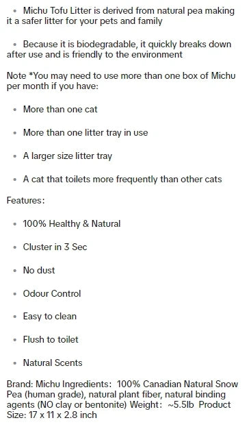 使用 Michupet 豆腐貓砂,讓您的貓砂盆保持乾淨整潔!它輕盈無塵,有助於吸收異味,讓您的家保持清新氣味。而且,它易於鏟取和清潔。立即購買豆腐貓砂,讓您的貓砂盆保持清新潔淨!輕盈吸水配方,只需少量 Michu 即可發揮巨大作用——它能夠吸收高達其乾重四倍的液體——因此,它的吸收時間比其他貓砂更長。
