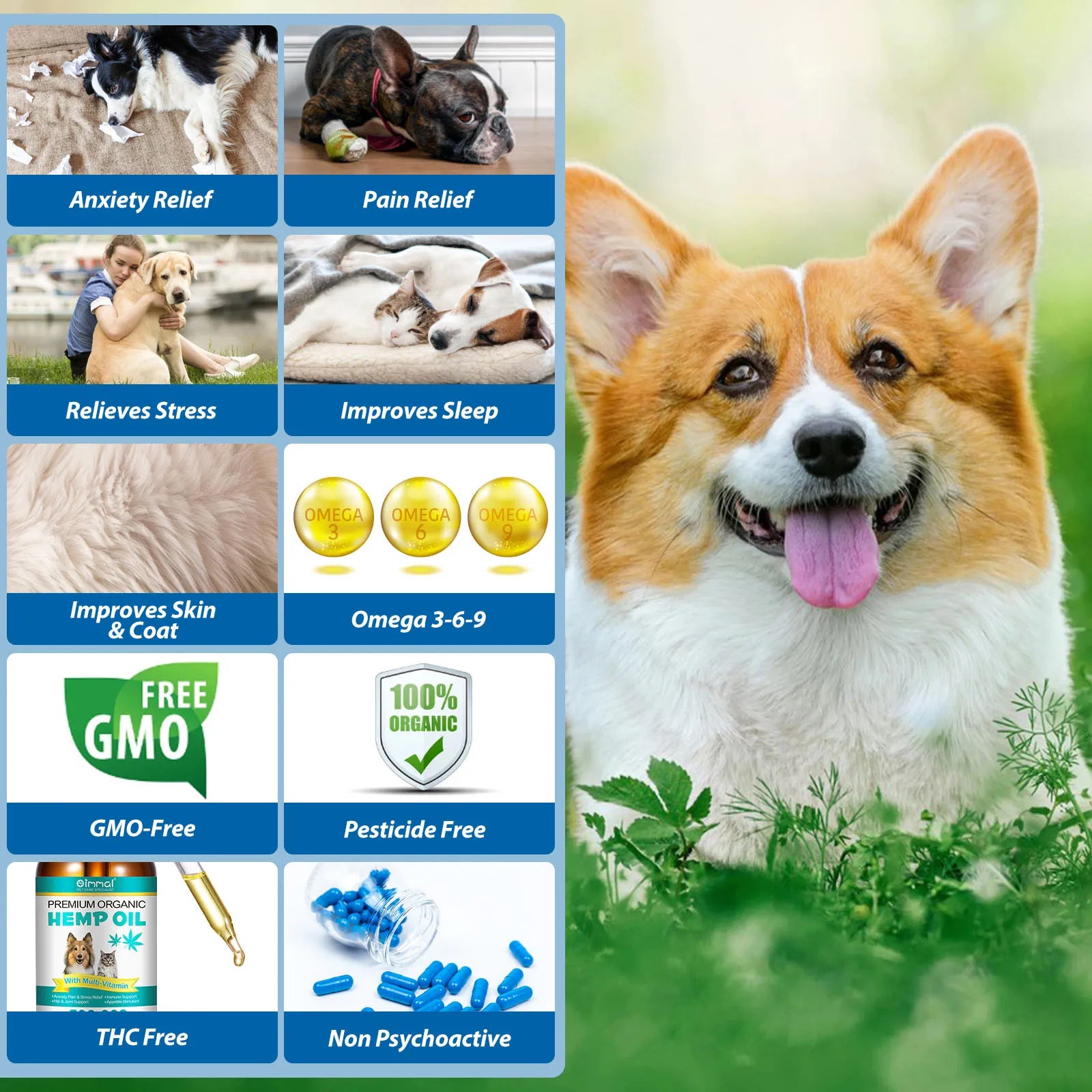 獸醫證明,大麻油中的成分如萜類、黃酮、精油、維生素 A 和 D、Omega 3-6-9 具有天然的鎮靜作用,有助於緩解壓力、分離焦慮、旅行問題、持續吠叫、攻擊性行為以及對暴風雨、煙火和焦慮相關狀況的恐懼。