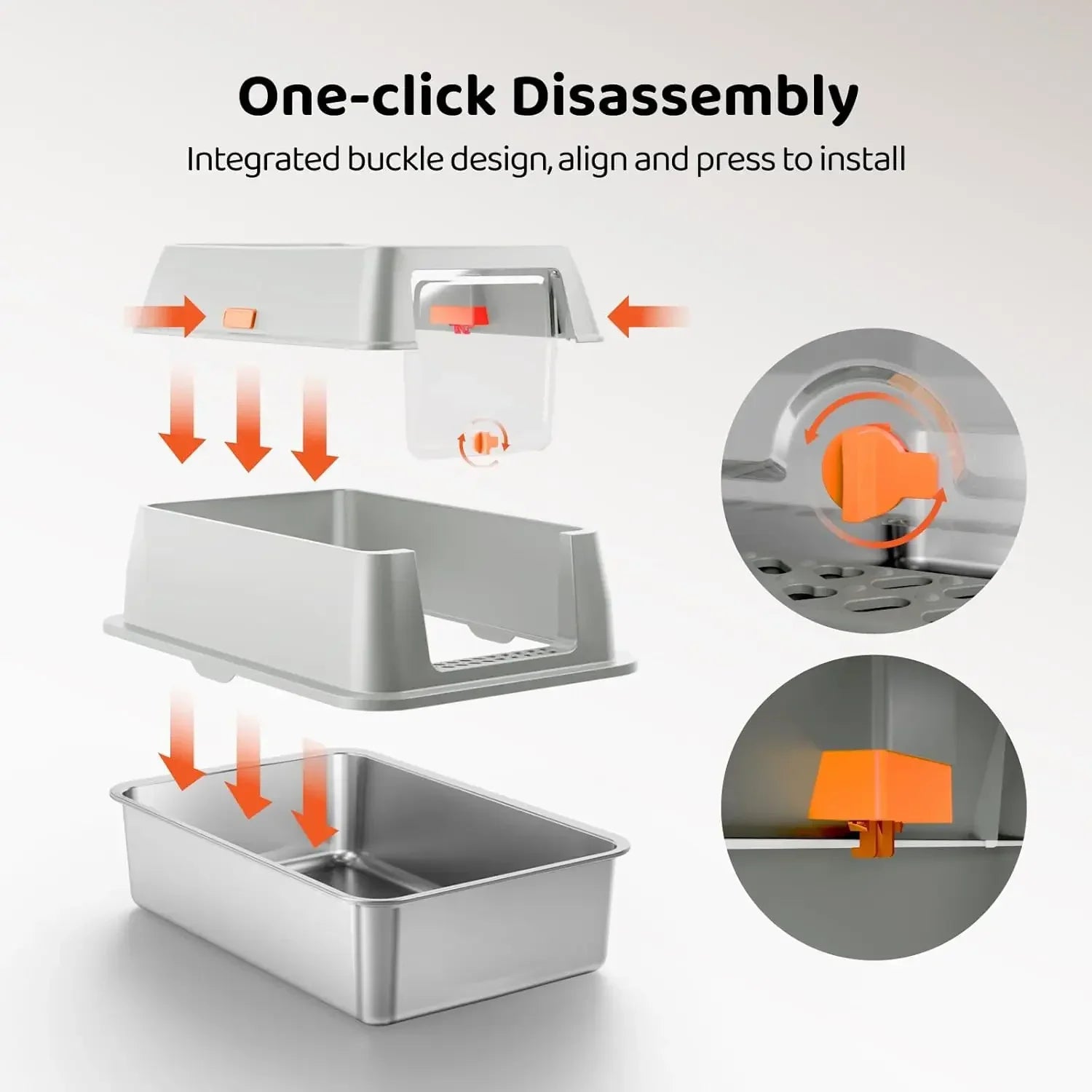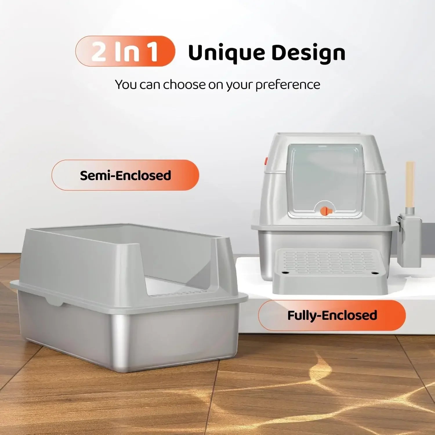 【防漏尿】Eosarcu 不銹鋼頂入式貓砂盆帶有高邊可拆卸蓋子,其無與倫比的密封性可有效防止尿液洩漏和氣味擴散。您也可以根據寵物的喜好選擇兩種模式(半封閉或封閉)。